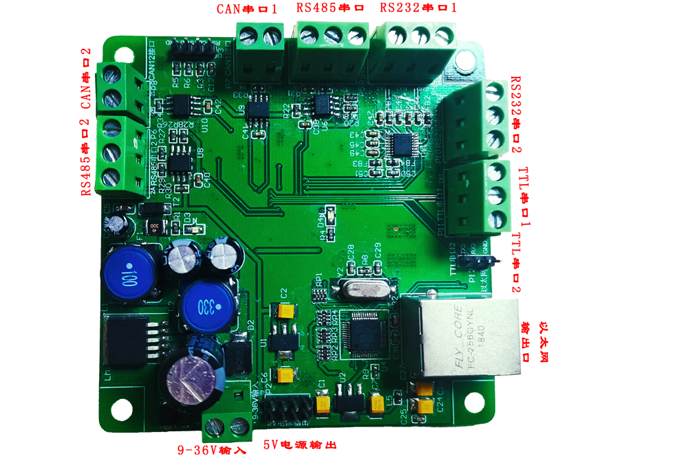 采用8路独立socket服务器通讯方式,集多种通讯协议于一体,设计防反接、防浪涌超压、防雷防静电保护,方便实用。使用嵌入式处理器可将CAN通讯协议数据、RS232通讯协议数据、RS485通讯协议数据以及TTL串口通迅数据实时透传到以太网接口的信号转接板,并采用TCP/IP Socket方式与外设通迅,减少与外设连接的线缆。可应用于自动驾驶车载系统、AGV底盘控制以及工业通讯领域。